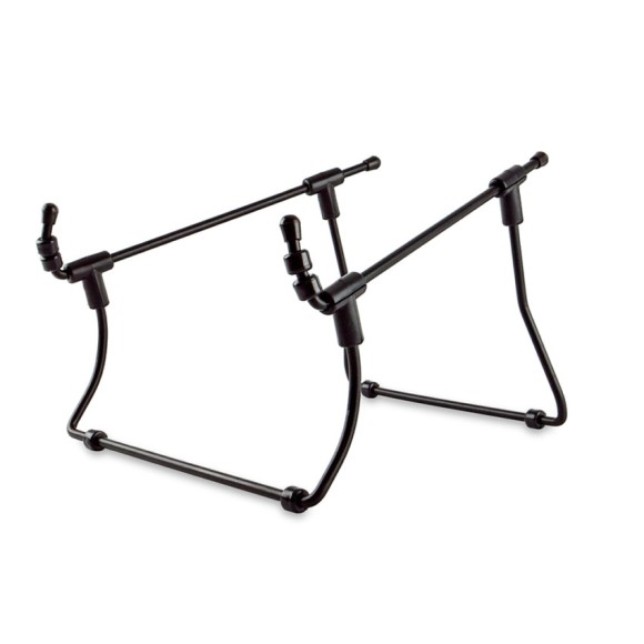 Suporta universal em metal para notebook preto com regulagem de altura frontal.