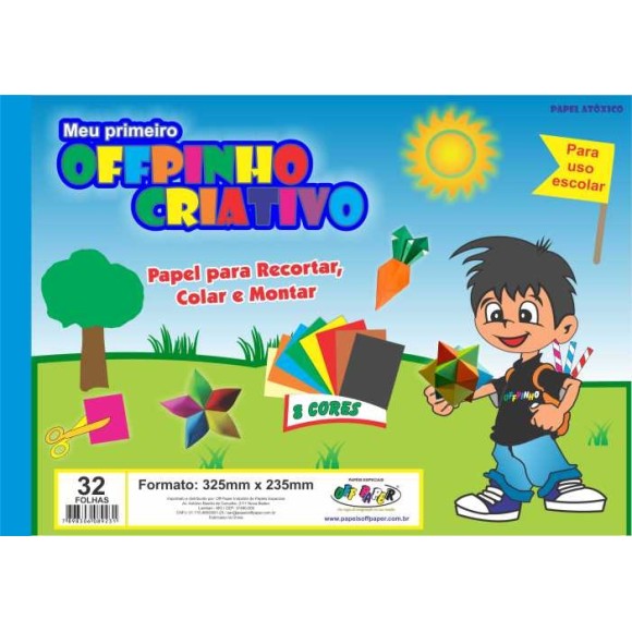 Bloco Meu Primeiro Offpinho Criativo com 32 folhas coloridas, para recortar, colar e montar.
