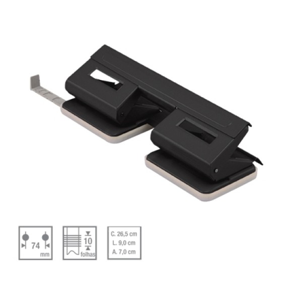 Perfurador 2 furos com escala, depósito de resíduos e guia para centralização de folhas, para até 12 folhas.