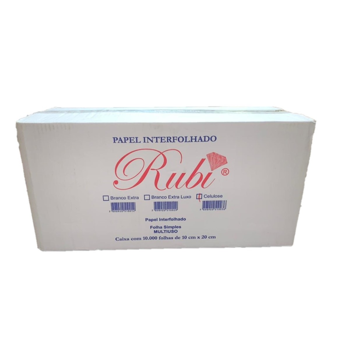 Caixa com 10.000 folhas simples de papel interfolhado multiuso celulose, com 10cm x 20cm cada folha.