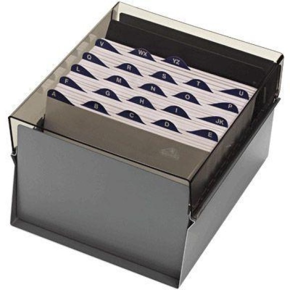 Fichário De Mesa Acrílico 5x8cm na cor branca. Base metálica com tampa em poliestireno. Possui capacidade para até 500.