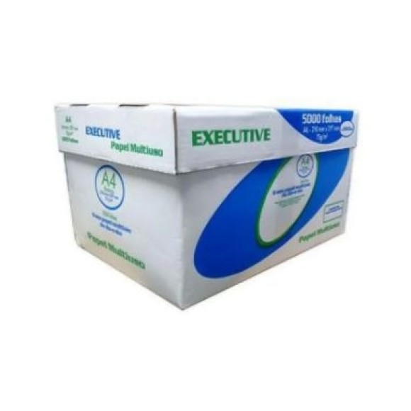 Caixa com 10 pacotes de sulfite branco A4, de 75g/m², com 500 folhas cada pacote, totalizando 5.000 folhas por caixa. Tamanho: 210mm x 297mm. Marca: Executive
