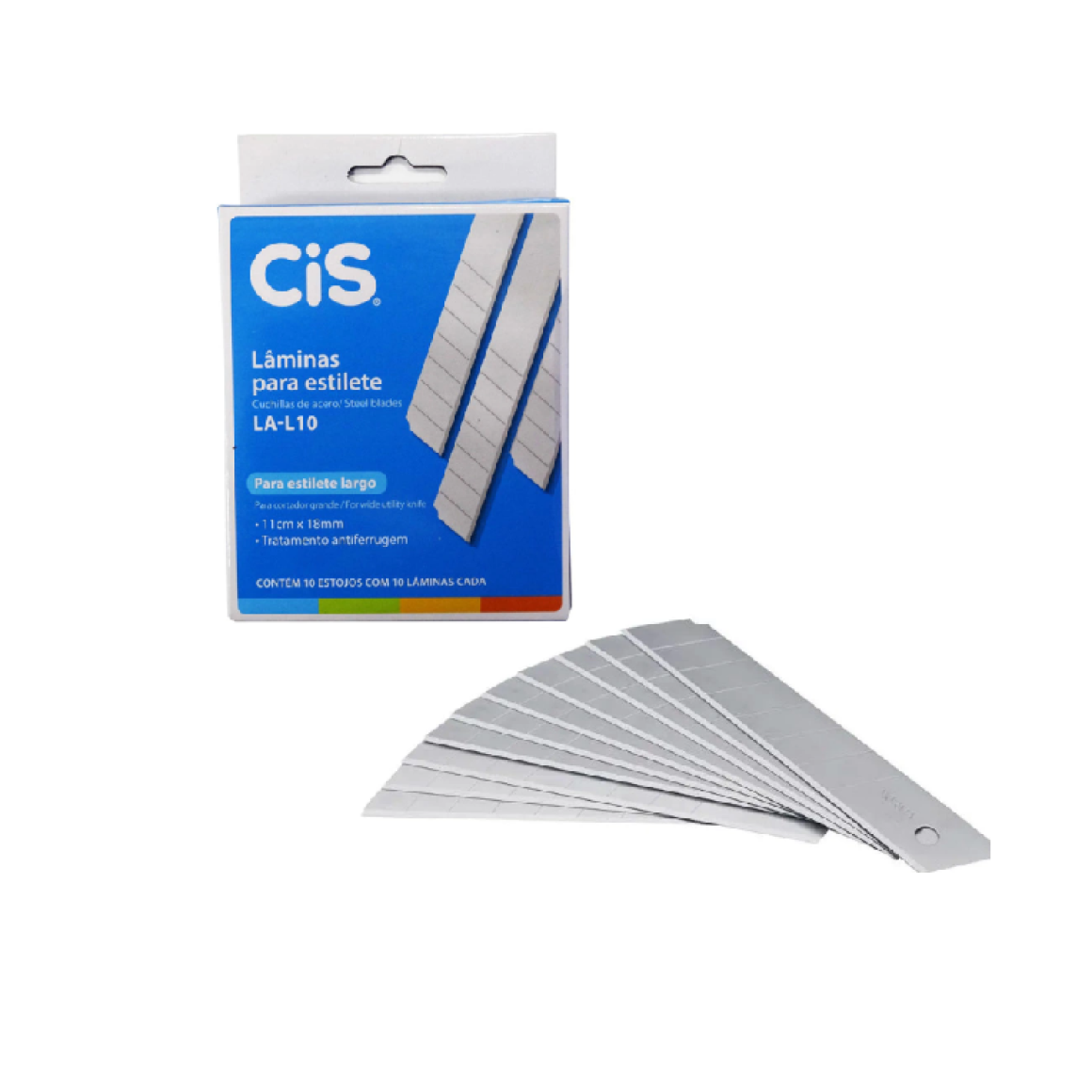 As Lâminas para Estilete Largo da CIS são ideais para cortes precisos e eficientes em diversos materiais. Com qualidade superior e durabilidade, essas lâminas são compatíveis com estiletes largos padrão, sendo perfeitas para uso em ambientes de escritório, artesanato e tarefas industriais.