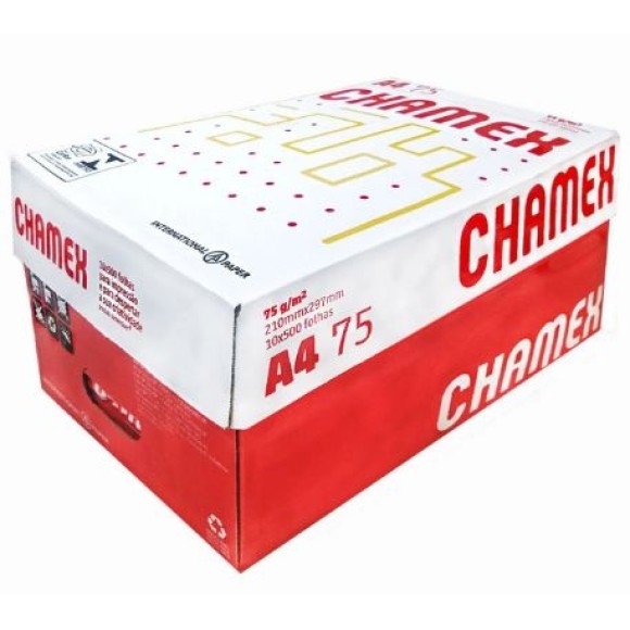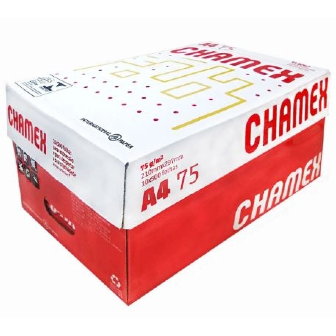 Caixa com 10 pacotes de sulfite branco A4, de 75g/m², com 500 folhas cada pacote, totalizando 5.000 folhas por caixa. Tamanho: 210mm x 297mm. Marca: Chamex