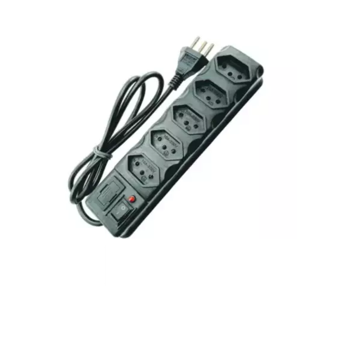 Filtro de linha tomada fêmea de 3 pinos, na cor preta, com 5 saídas de tomada.