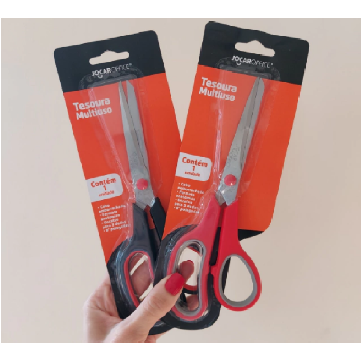 Tesoura Multiuso 21cm com lâmina em aço inox, cabo ergonômico e emborrachado, encaixe para 3 dedos de 8 polegadas.