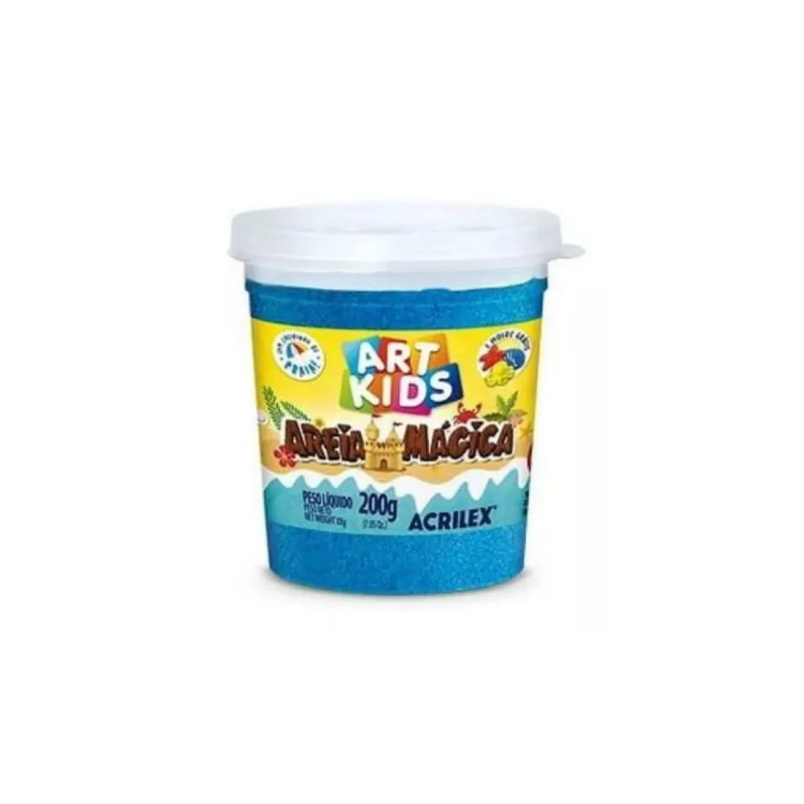 Pote com 200g de areia mágica na cor azul e 1 forminha com tema diversos de praia.