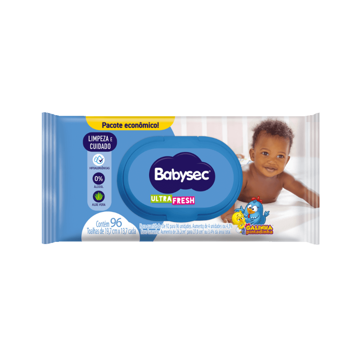 Pacote com 48 toalhas umedecidas Ultra Fresh Galinha Pintadinha, com 19,7 x 13,7 cm cada toalha. Hiipoalergênicas, sem álcool e com aloe vera. Marca: Babysec