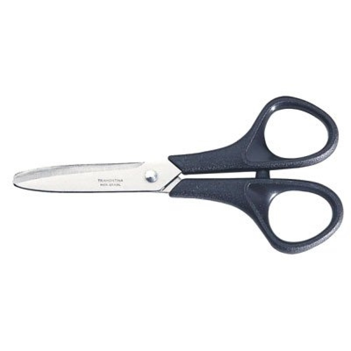 Lâminas de aço inox, cabo de prolipropileno e ponta redonda.